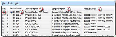 The quick, easy to use PX-CFGSW configuration utility helps setup the bus coupler to match the configuration of the network and identify the address of each Protos X terminal. The simple to read layout shows: