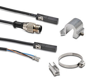Harsh duty IP69K washdown rated 5mm square solid-state position switches mount on pneumatic cylinders with corresponding-sized T-slots, round cylinders (such as NITRA A-Series or F-Series, with optional CPSS mounting bands), or tie-rod cylinders (NITRA D-series with optional CPSA adapters).
