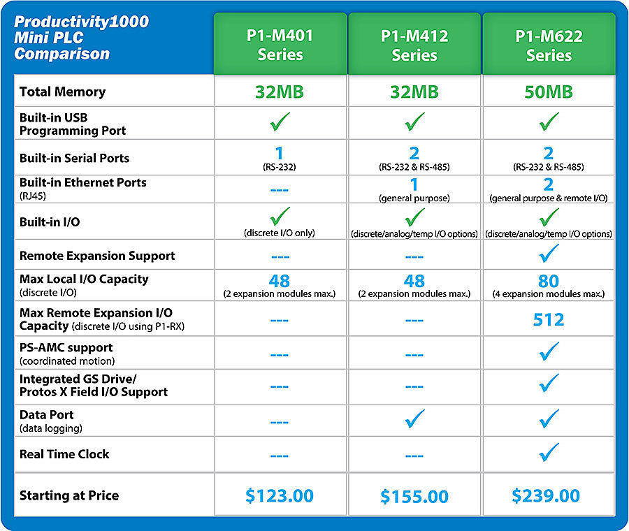 The Productivity1000 Mini PLCs offer even more hardware options for the Productivity PLC family. As the first-ever standalone model for the Productivity family, the Mini PLCs combine the CPU and I/O into a single unit. Other Productivity series require you to buy the I/O and CPU separately, but with the Mini series, you get a choice of models with embedded discrete or analog/temperature I/O. This design provides significant cost savings, especially for smaller systems, and can be expanded if needed for larger systems. 17 models are available to choose from with different communication options, I/O types and capacities, and available memory storage.