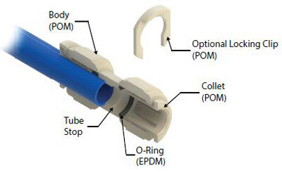 HydroMode push-to-connect fittings are designed for potable water and beverage systems. All fittings have NSF-51 and NSF-61 certifications and are rated for up to 145psi at 70 degrees C (158F). The bodies and collets are made from acetal; O-rings are synthetic rubber. Optional locking clips prevent accidental tube removal.