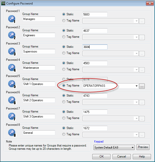 Passwords can even be stored as tag values, and changed from the panel (or PLC), without having to bring up the programming software - just remember to password protect the "change password" button!