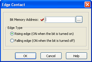 The Edge Contact turns ON when the related bit transitions from OFF to ON (Rising Edge) or ON to OFF (Falling Edge).