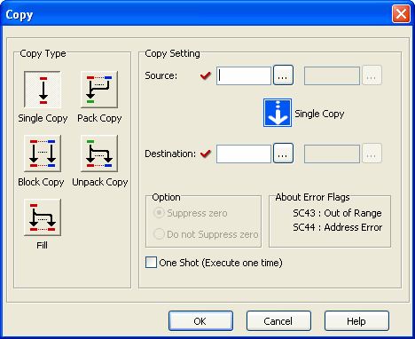 identified by a range of memory addresses, and only the first register of the destination range is required. The Block Copy opion