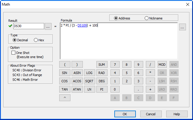 Two sets of mathematical operators are available within the Math instruction: decimal and hexadecimal. When the Decimal radio button