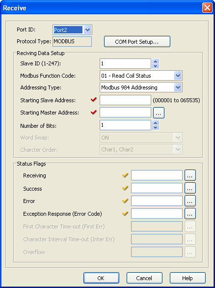 The Receive Instruction accepts Modbus or ASCII communications to your ladder program.