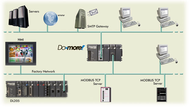 the Do-more CPU (H2-DM1E) for just $103 more than the non-Ethernet version (H2-DM1). But many applications require a second Ethernet port. Add an H2-ECOM100 and connect your Do-more to segregated